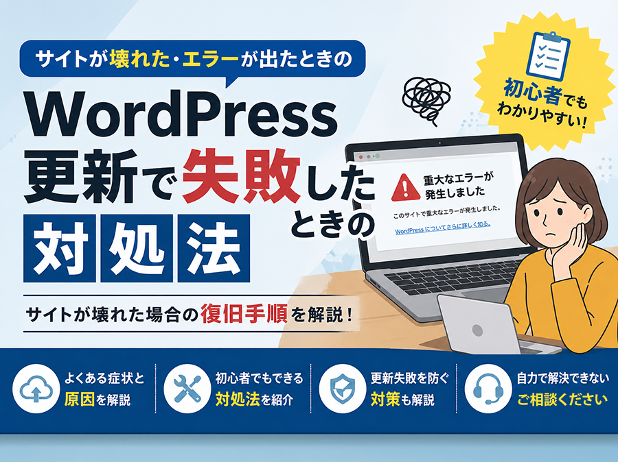 - WordPress更新で失敗したときの対処法|サイトが壊れた場合の復旧手順を解説WordPressを更新した後に、 「サイトが真っ白にな… 続きを読む: WordPress更新で失敗したときの対処法|サイトが壊れた場合の復旧手順を解説